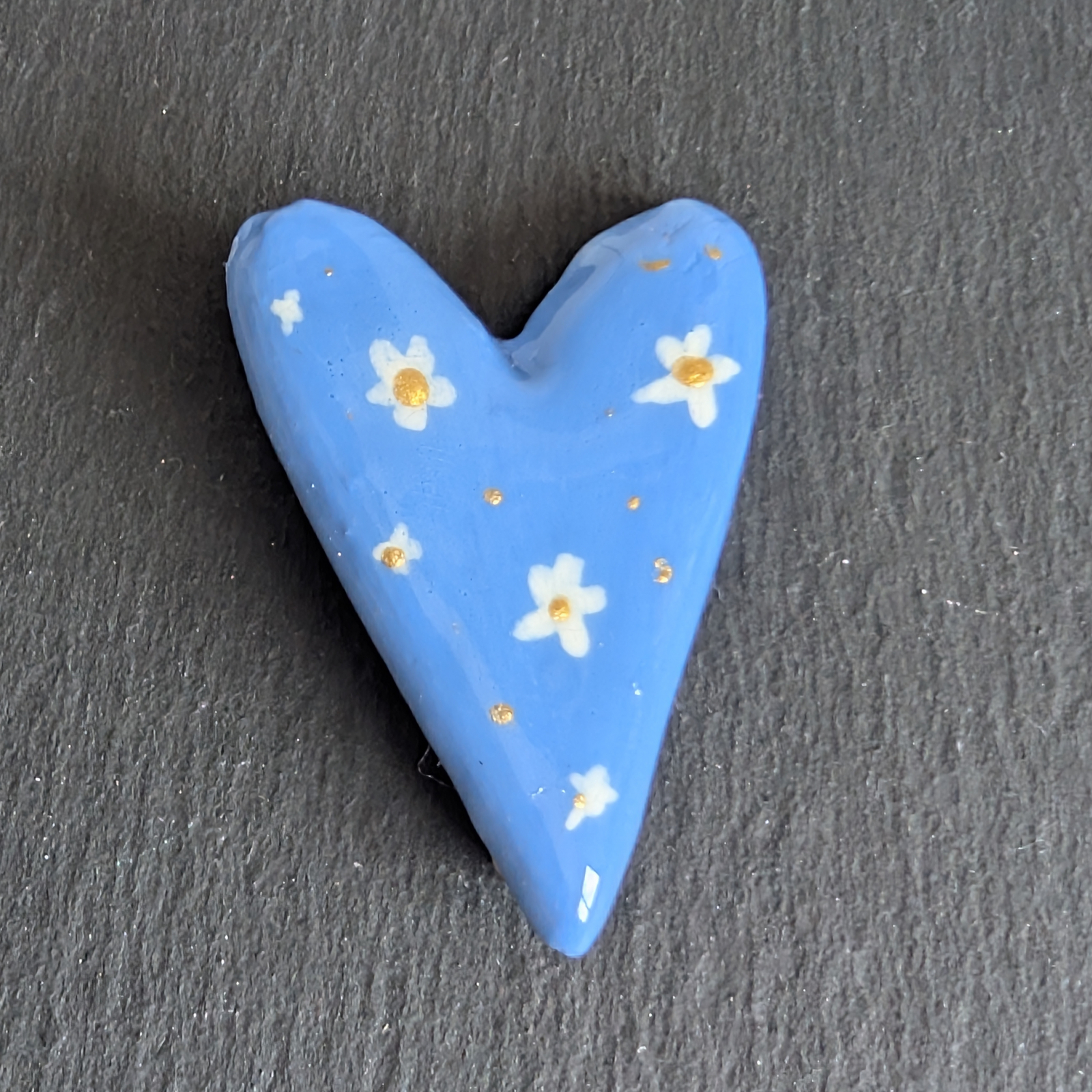 Broșă confecționată manual din lut cu uscare la aer, pictata cu vopsele acrilice și lăcuită cu rășina UV pentru un plus de luciu și duritate.