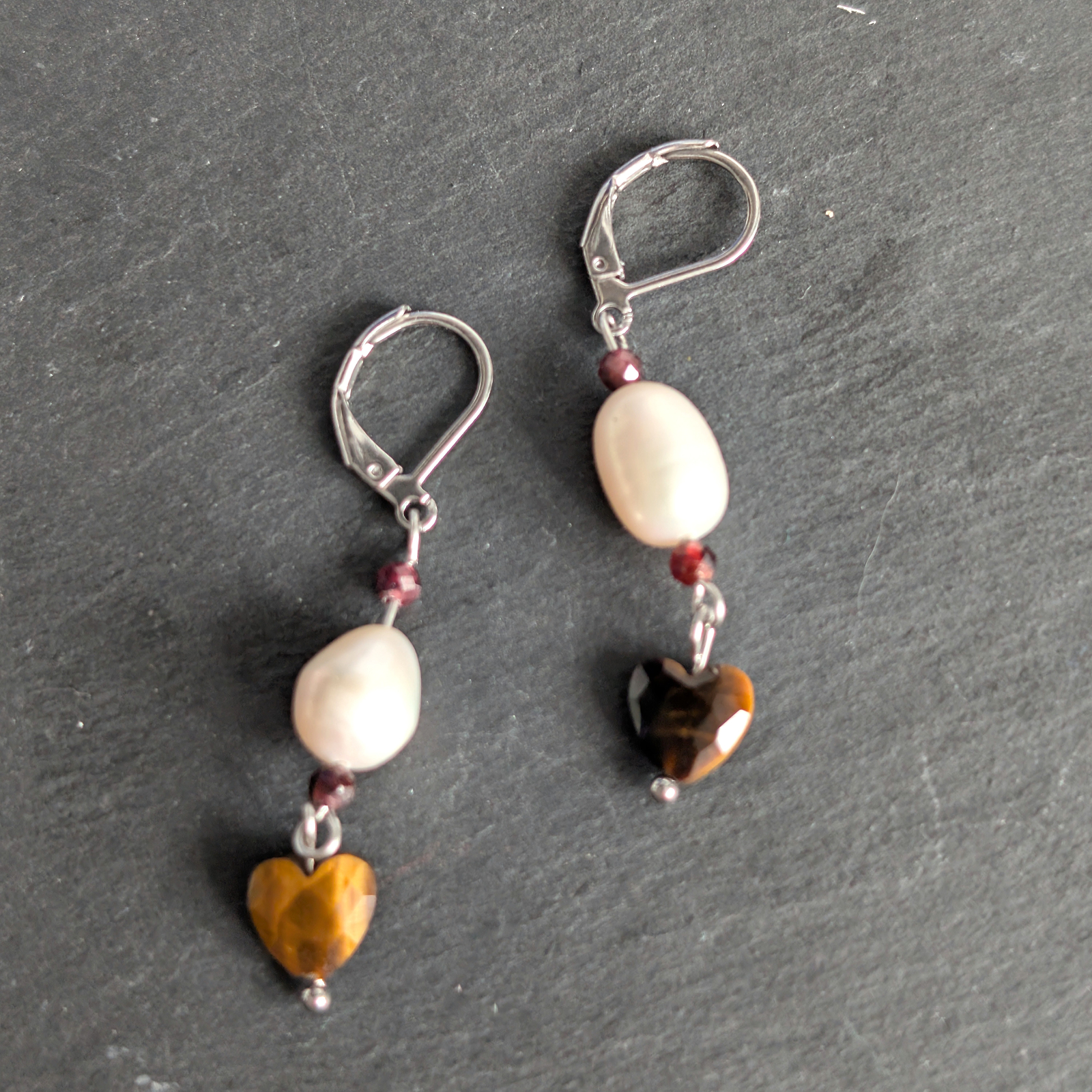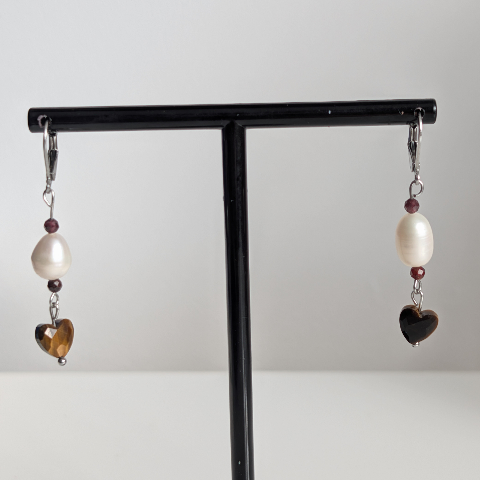 Cercei confecționați din inimă de obsidian, perle de cultură și turmalină. Accesoriile sunt din oțel inoxidabil
