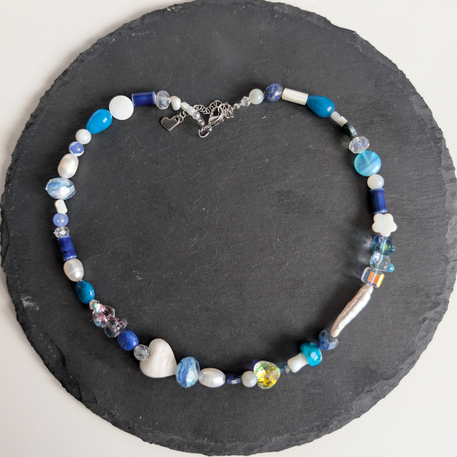 Colier confecționat din perle de cultură, jad, sidef,lapis lazuli, aventurin, mărgele de ceramică și mărgele de sticlă.  Accesoriile sunt din oțel inoxidabil.