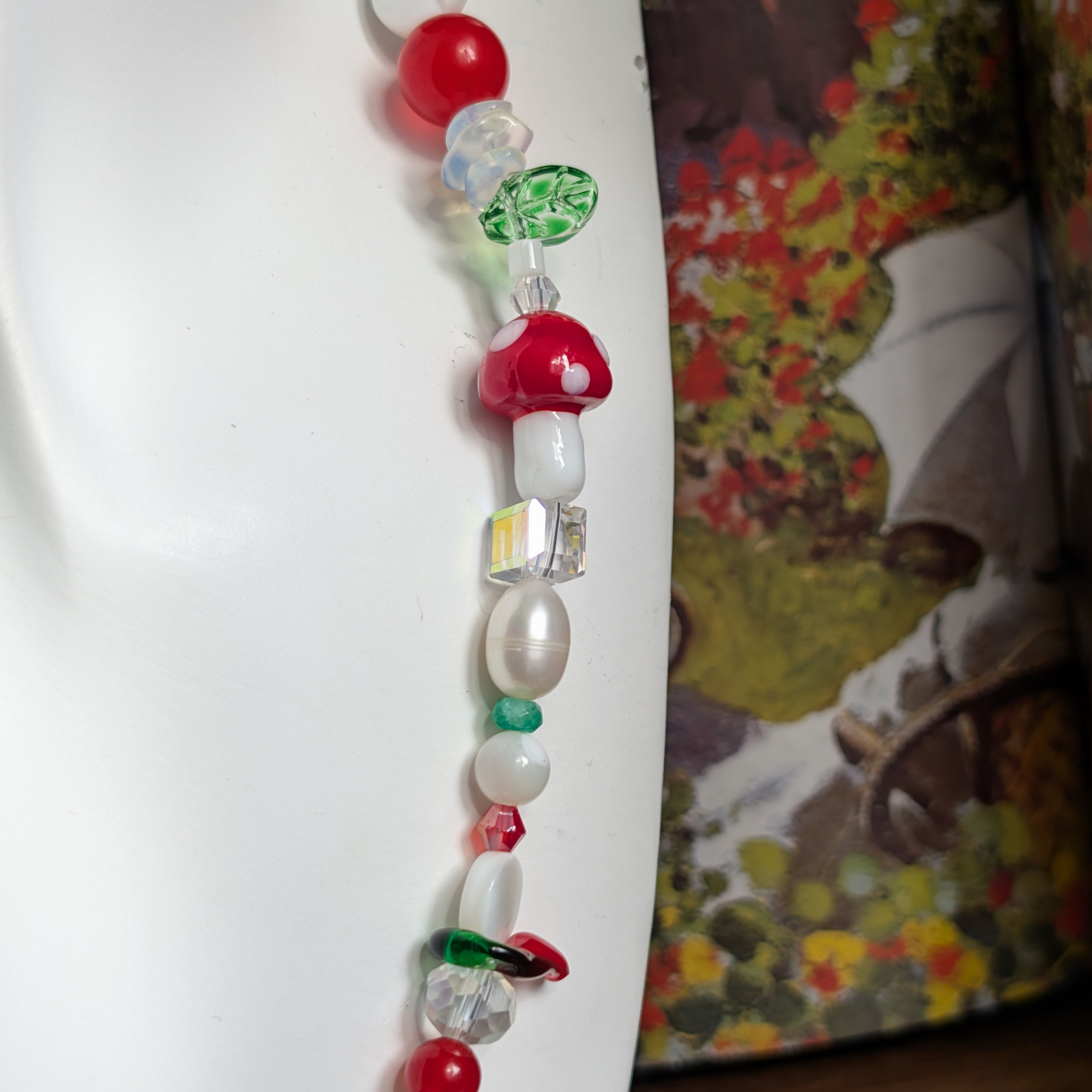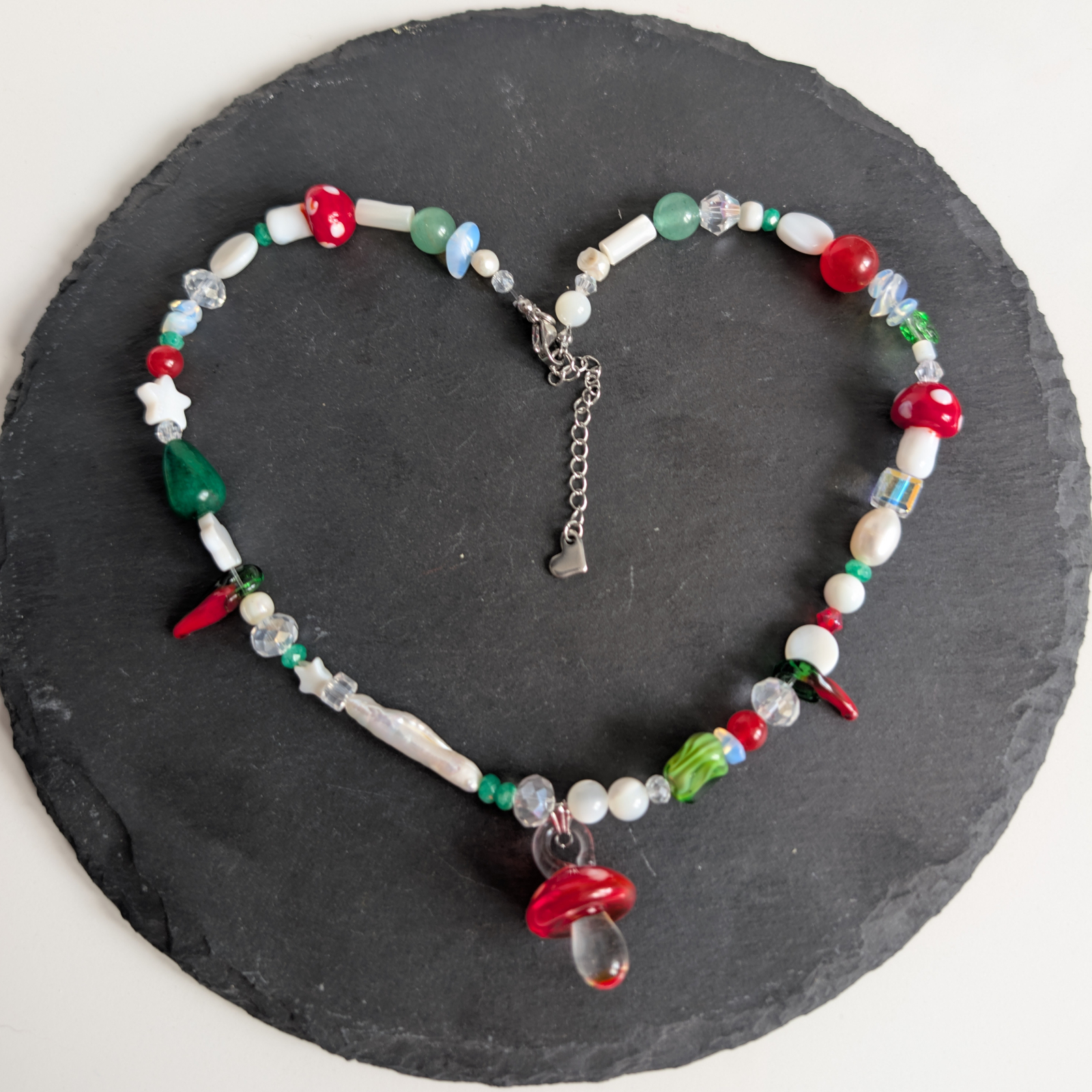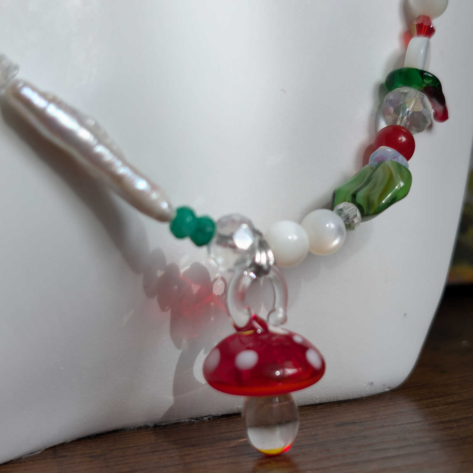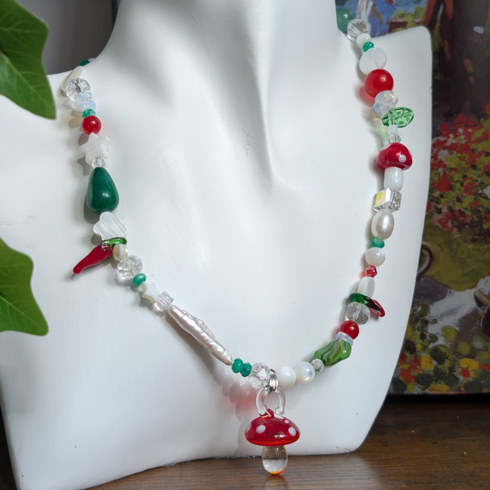 Colier confecționat din perle de cultură, jad, sidef și mărgele de sticlă.  Accesoriile sunt din oțel inoxidabil.