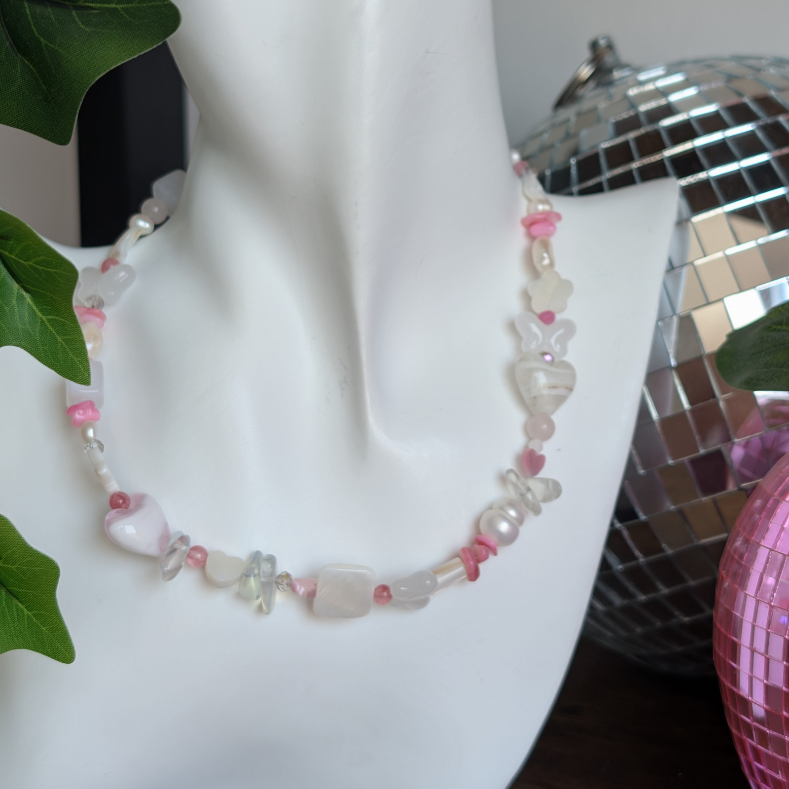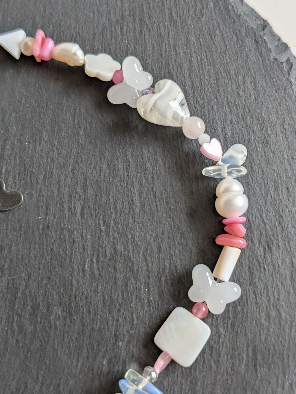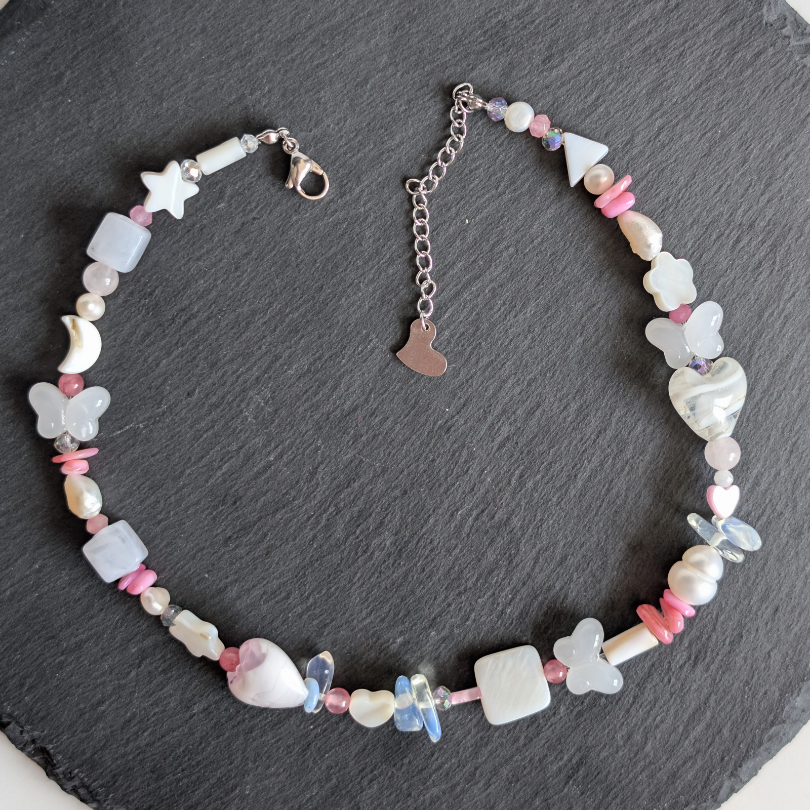 Colier confectionat din mărgele de sticlă, quartz,  piatra lunii, sidef și cristale preciosa. Accesoriile sunt din oțel inoxidabil. Lungime 34 cm+ 4 cm prelungire.