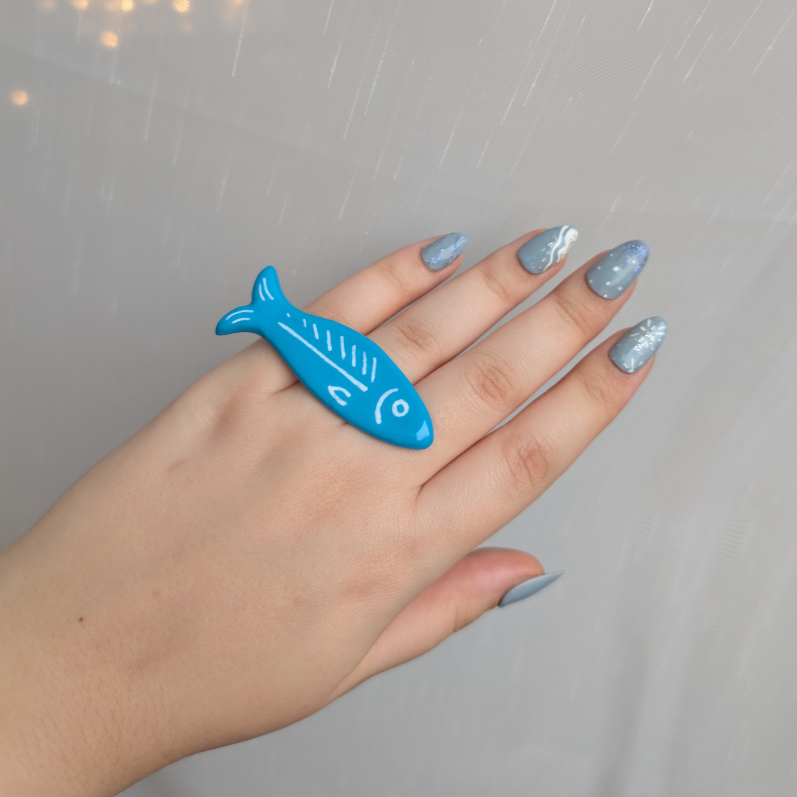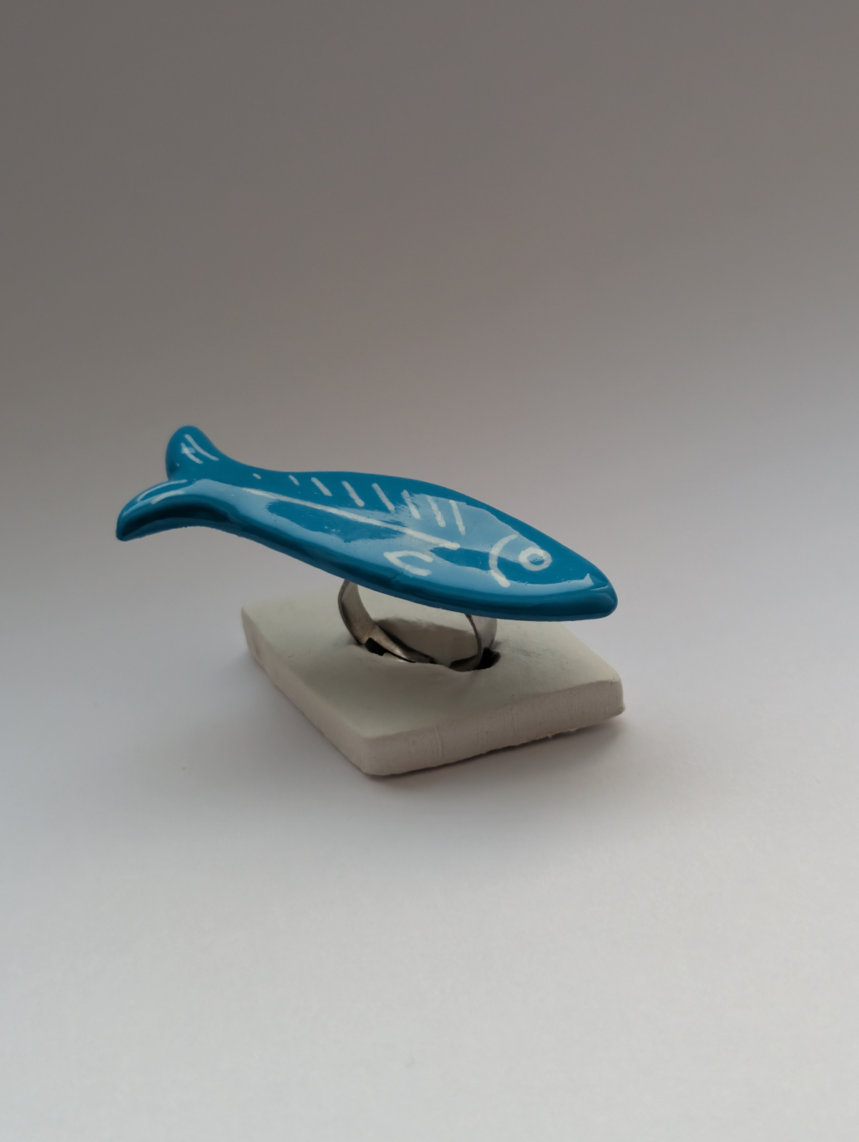 Inel confecționat din lut cu uscare la aer, pictat manual cu vopsele acrilice și acoperit cu rășina UV. Baza este din oțel inoxidabil, iar dimensiunea este reglabilă.