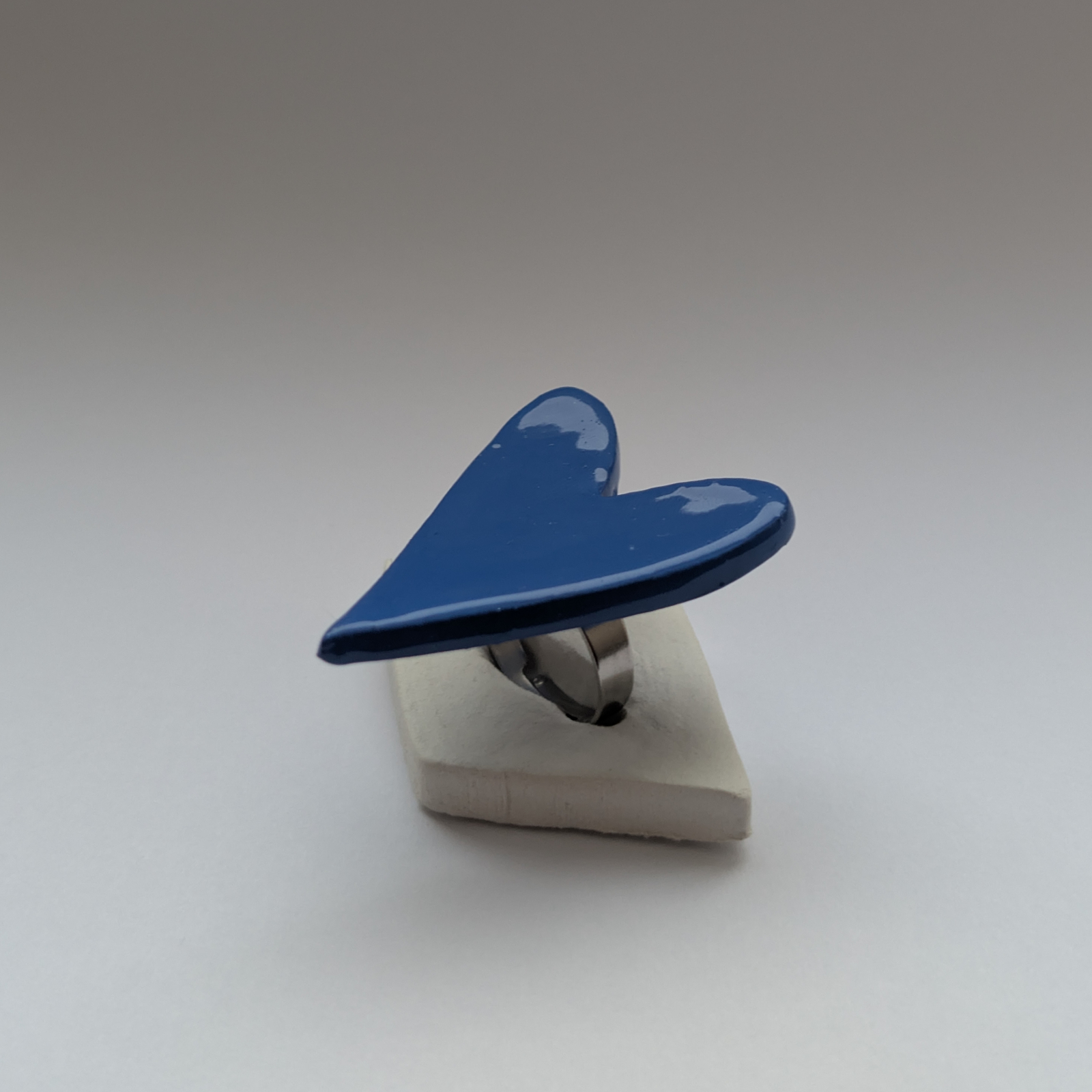 Inel confecționat din lut cu uscare la aer, pictat manual cu vopsele acrilice și acoperit cu rășina UV. Baza este din oțel inoxidabil, iar dimensiunea este reglabilă.